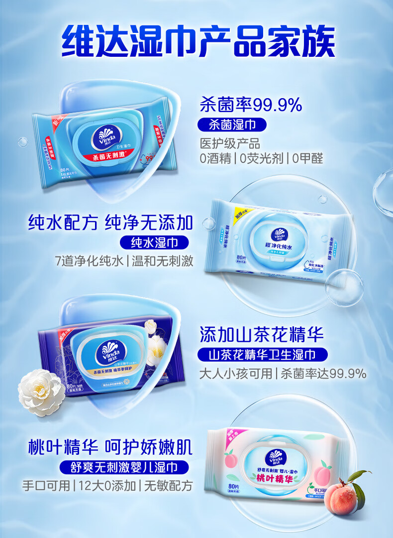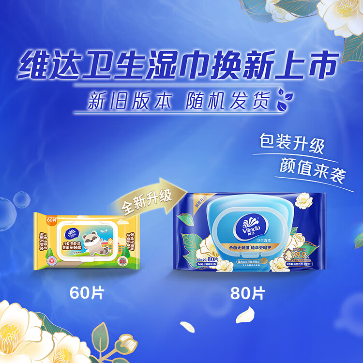 维达(Vinda)杀菌湿巾80片 山茶花精华湿纸巾 杀菌率99.9% 60片新旧规格随机