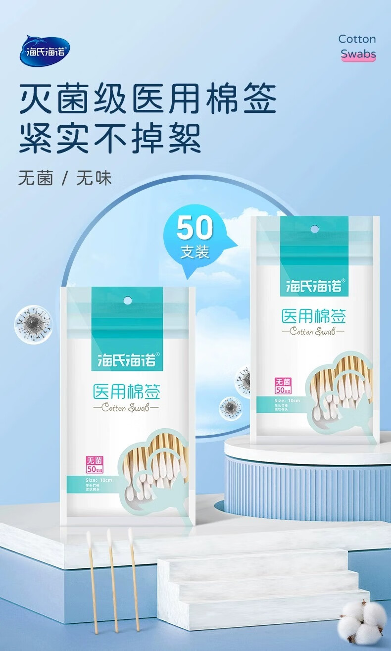 商品名称:海氏海诺 医用棉签 无菌消毒棉签棒 50支*6袋/300支塑封口清洁消毒护理成人婴儿单头竹棒棉签大头