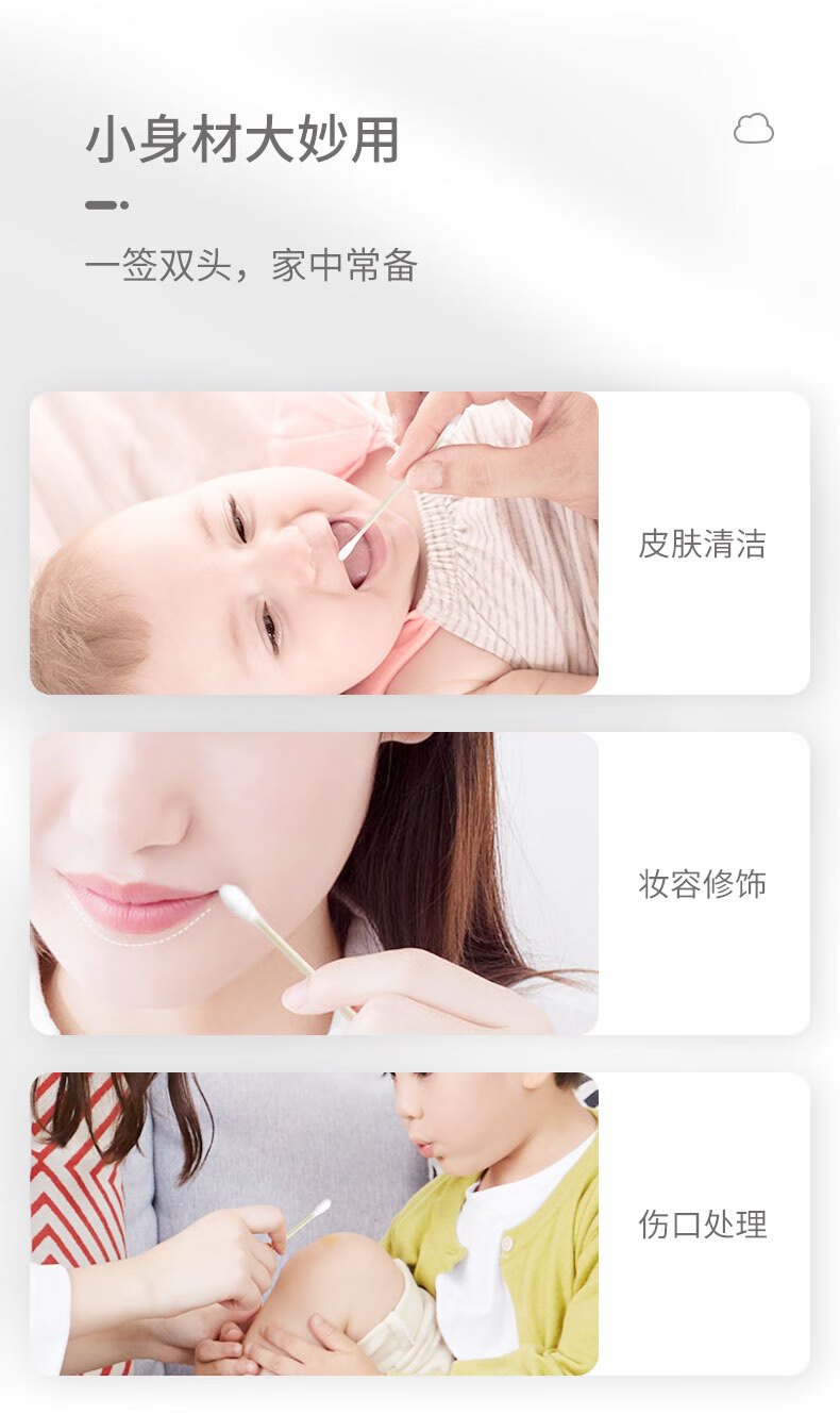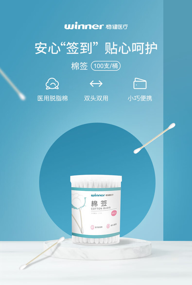 商品名称:稳健双头医用棉签棉棒100支掏耳鼻清洁消毒化妆脱脂棉棉签竹棒