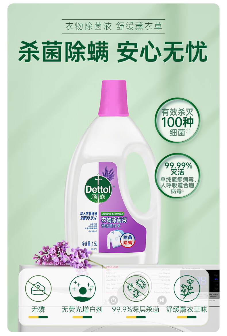 商品名称:滴露(Dettol)衣物除菌液 薰衣草1.5L 儿童衣物杀菌消毒除螨