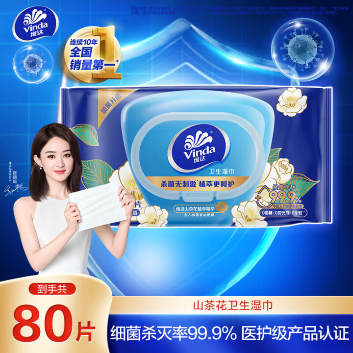 维达(Vinda)杀菌湿巾80片 山茶花精华湿纸巾 杀菌率99.9% 60片新旧规格随机