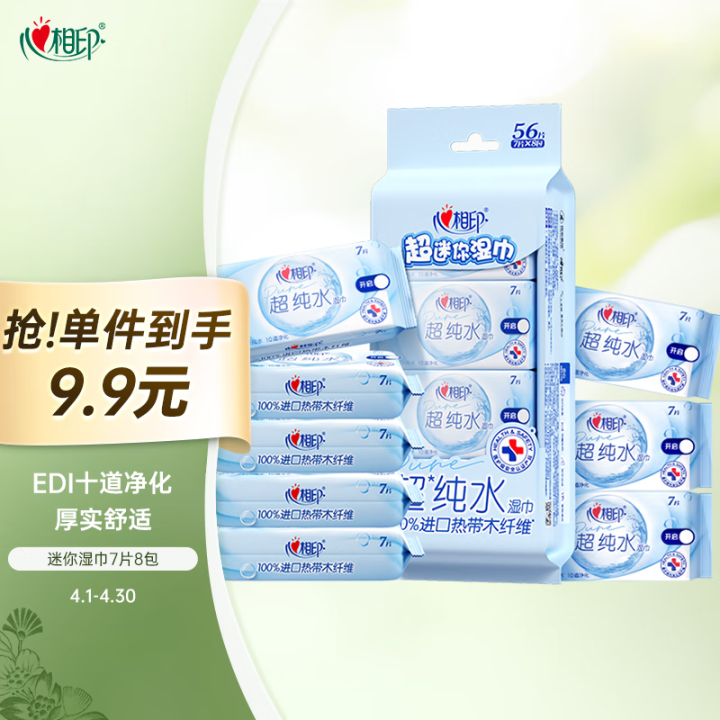 心相印湿巾成人超纯水系列 7片*8包小包便携迷你湿纸巾
